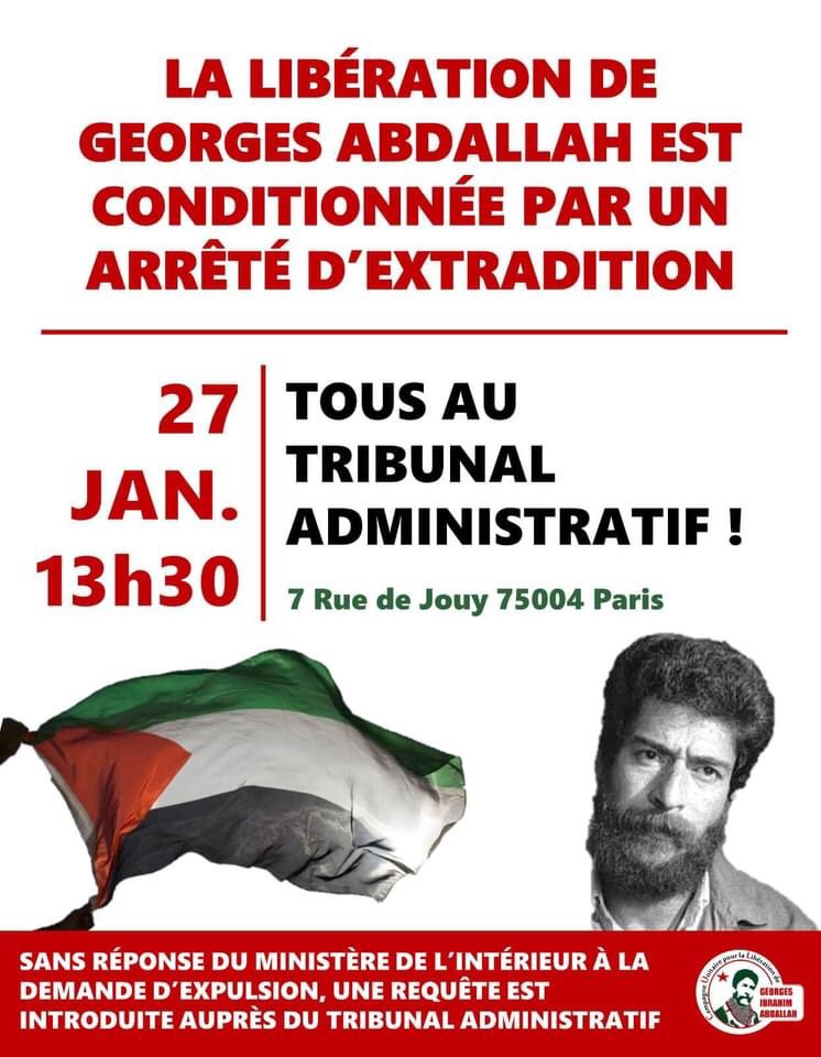 Le prisonnier George Ibrahim Abdullah est un militant communiste arrêté en France en 1984 alors que Beyrouth et le sud du Liban étaient sous une invasion israélienne qui a tué des milliers de civils. Il est accusé d’avoir assassiné des militaires israéliens et américains impliqués dans les invasions. Au moment de son procès, le procureur a exigé dix ans, mais le juge lui a pesé sa peine à vie, après avoir accusé le public français d’accuser la famille du prisonnier Abdullah d’attentats à la bombe à Paris qui ont touché des civils, puis de redétecter le réseau qui a perpétré les attentats à la bombe avec lesquels la famille d’Abdullah n’avait rien à voir avec. Le prisonnier George Abdullah a été condamné à trois reprises, en 2003 et 2012 par la Cour ordinaire et en 2013 par la Cour d’appel. Mais la dernière décision a été bloquée par l’administration française par ordre américain lorsque le ministre de l’Intérieur a refusé de signer le journal d’expulsion du prisonnier George Abdullah vers le Liban. En juillet 2020, l’avocat du prisonnier, George Ibrahim Abdullah, a soumis au ministre français de l’Intérieur une demande de signature de la décision de l’expulser vers le Liban, après quoi il n’a reçu aucune réponse, ce dernier est revenu et a intenté une action en justice devant le tribunal administratif demandant au ministre de signer. Le 27 janvier, à 14 heures, le tribunal administratif tiendra une audience publique pour discuter de l’affaire. Par conséquent, nous appelons à la campagne unifiée de libération du prisonnier George Abdullah en France pour se rassembler devant le tribunal administratif et une forte présence dans la salle d’audience afin de faire pression sur le ministre de l’Intérieur pour qu’il mette en œuvre la décision judiciaire de libérer le prisonnier sous le slogan “Il doit être signé”. Nous appelons également, par l’intermédiaire de la Ligue socialiste internationale, à une campagne médiatique internationale pour faire pression sur le ministre français de l’Intérieur et son successeur, le gouvernement.